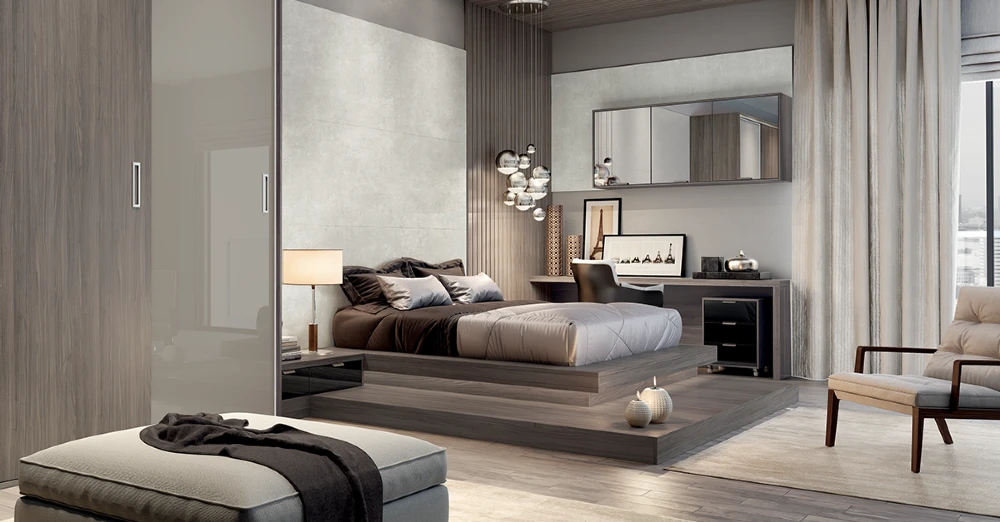 Essas camas de chão, que possuem um degrau na base, é característico em dormitórios modernos. E você pode aproveitar o espaço do degrau para colocar objetos, como vasos ou mesmo uma iluminação acoplada. Dessa forma, o degrau, além de ser o apoio da cama, também funciona como uma estante para você deixar exposto algo que goste.