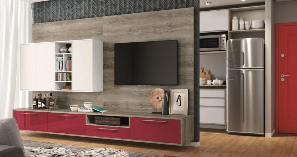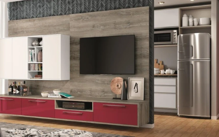 Organizar a sala com gavetões fica muito mais fácil! Além desse home theater ter espaço suficiente para você guardar aqueles itens que não quer perdidos pela casa, também deixar exposto seus livros favoritos nas prateleiras. Além disso, esse móvel pode ser o destaque do seu projeto, já que a cor funciona como contraste em ambientes cleans ou industriais.