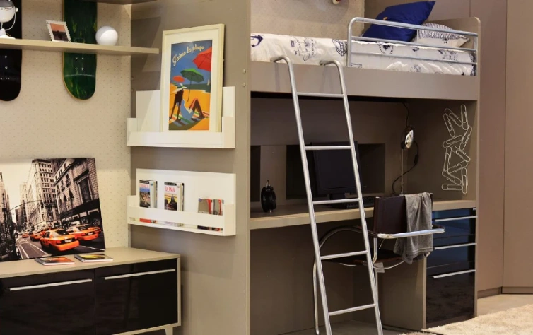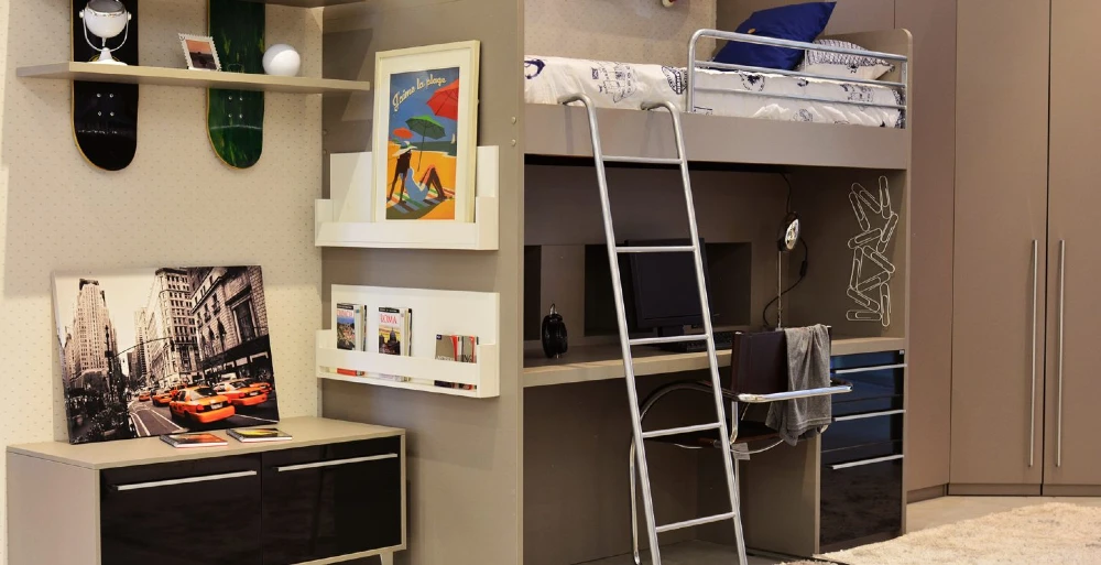 Neste quarto, trouxemos a temática do esporte para a decoração e investimos em peças como skates para completar. Ao lado da cama, é possível enxergar os organizadores de quadro – é um jeito mais moderno de expor a arte dentro de casa. O melhor desse quarto é que tudo que você precisa está em um único móvel! Se você está procurando um projeto assim, pode falar com a Italínea.