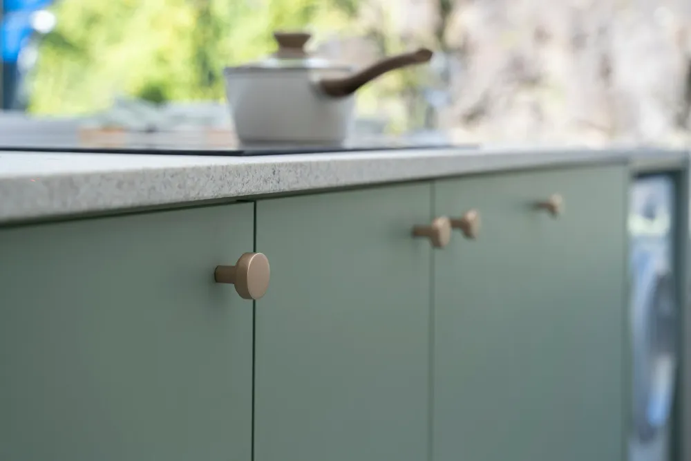 Ao escolher armários, verifique se as portas não bloquearão seu fluxo de trabalho quando estiverem abertas. Com certeza, você não vai querer as portas da geladeira e do armário batendo uma na outra toda vez que você abrir.
