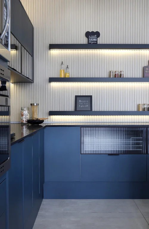 Feito isso, é hora de pensar na disposição dos armários, prateleiras e gavetas em sua cozinha. Uma boa dica de economia aqui são as prateleiras abertas, que não apenas oferecem uma estética moderna, mas também são mais acessíveis economicamente, proporcionando um visual arejado à cozinha.