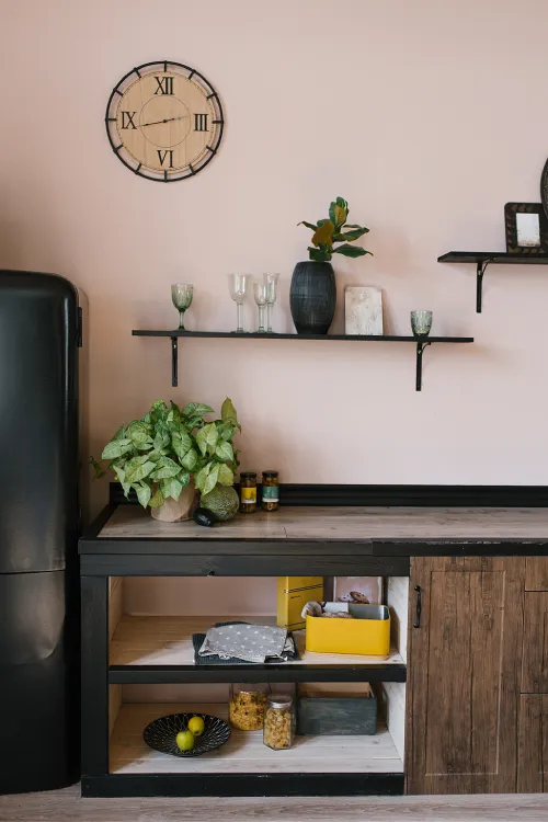 O preto é muitas vezes usado em pequenos detalhes, como puxadores de gavetas, luminárias ou molduras de janelas, para adicionar contraste e profundidade ao espaço. O preto pode ajudar a destacar os outros elementos e cores do espaço.